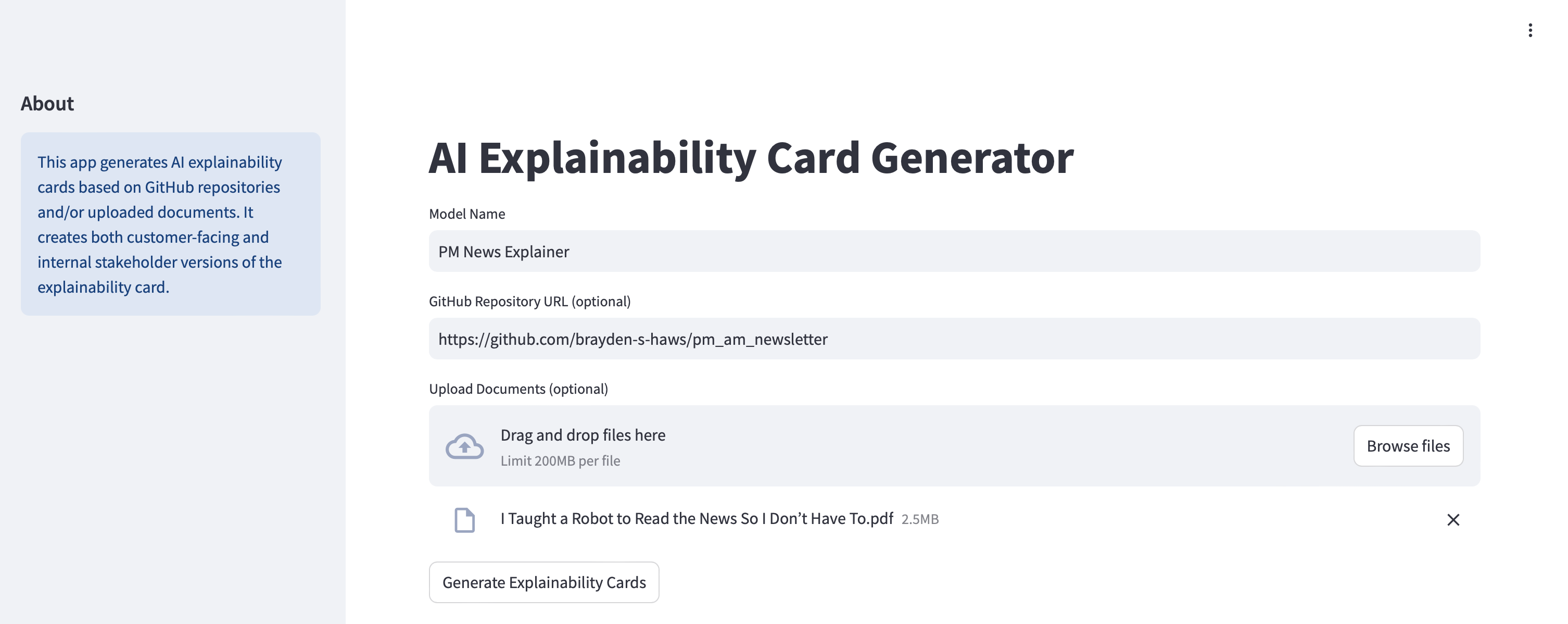 The AI Explainability Card Generator included several key features that made it a powerful tool for AI documentation: